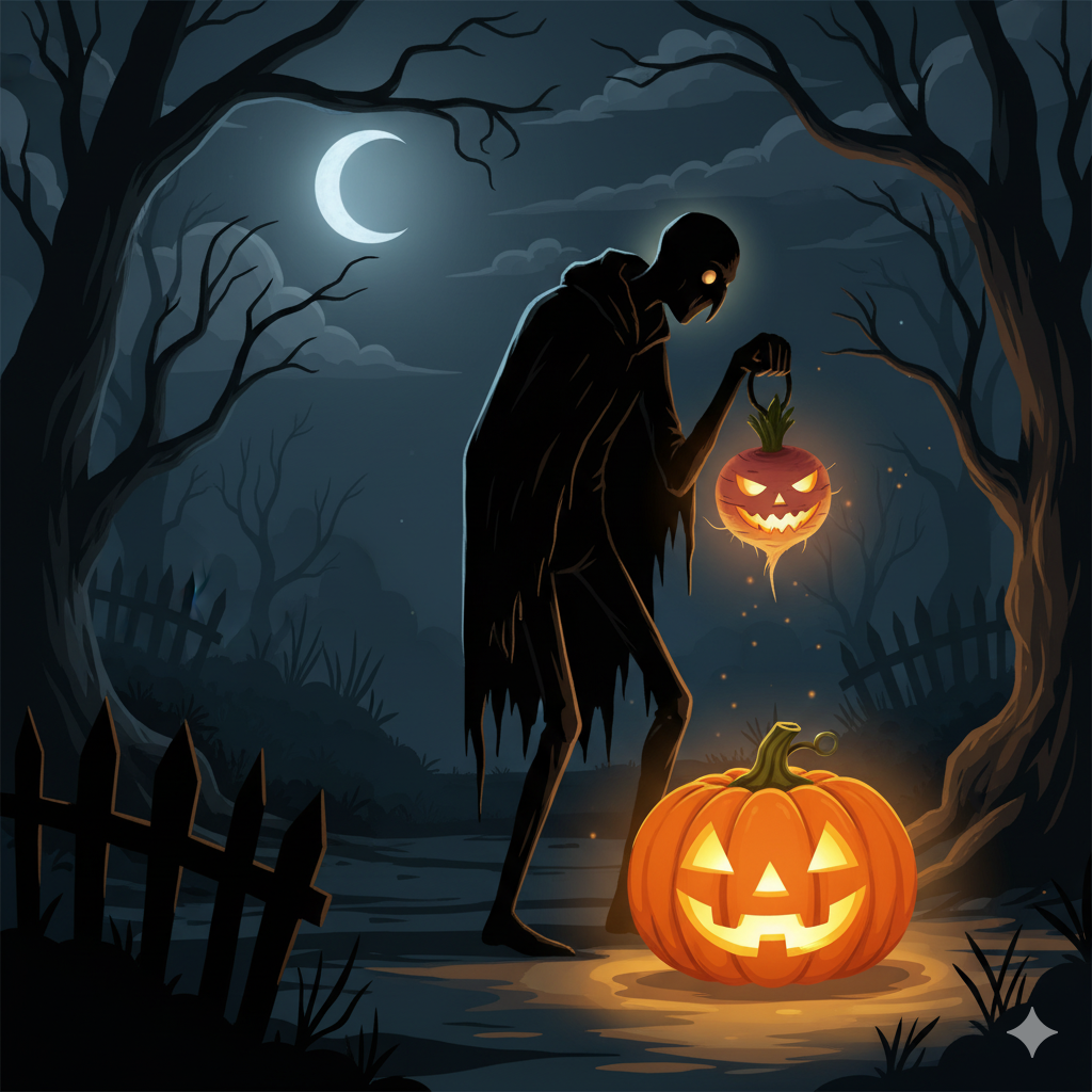 彼は生前、人を騙してばかりの悪党でしたが、あまりの悪行に地獄からも天国からも行く場所がなく、カブをくり抜いて作ったランタンを持って、永遠に暗闇をさまようことになったと言われています。