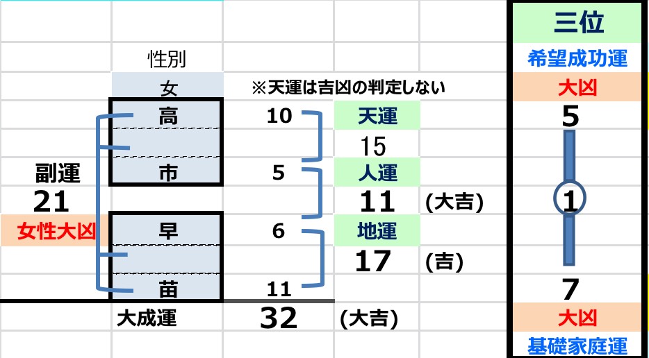 ここには、天運10画、人運11画(大吉)、地運17画(吉)、副運21画(女性大凶)、大成運32画(大吉)といった、彼女のパーソナリティと運勢を象徴する画数が鮮明に刻まれています。